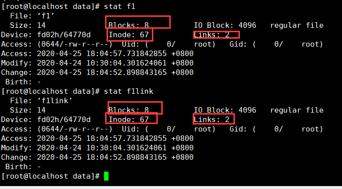 如下图可以看到硬连接和原文件其中的inode和data block,并且增加了连接数