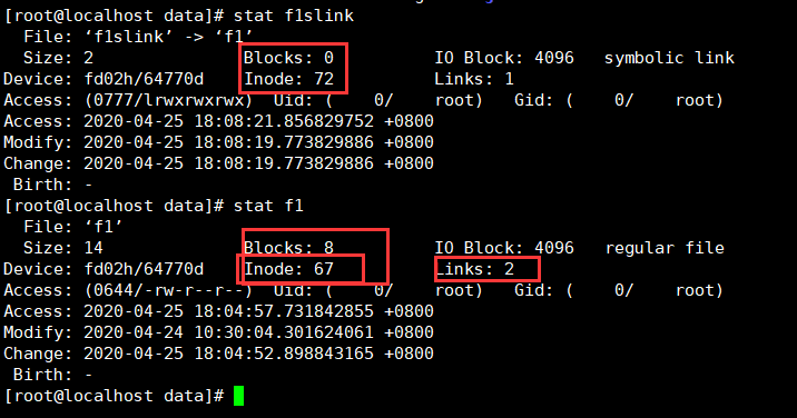 如下图可以看见原文件和软连接inode和data block不一致,并且原文件连接数未变