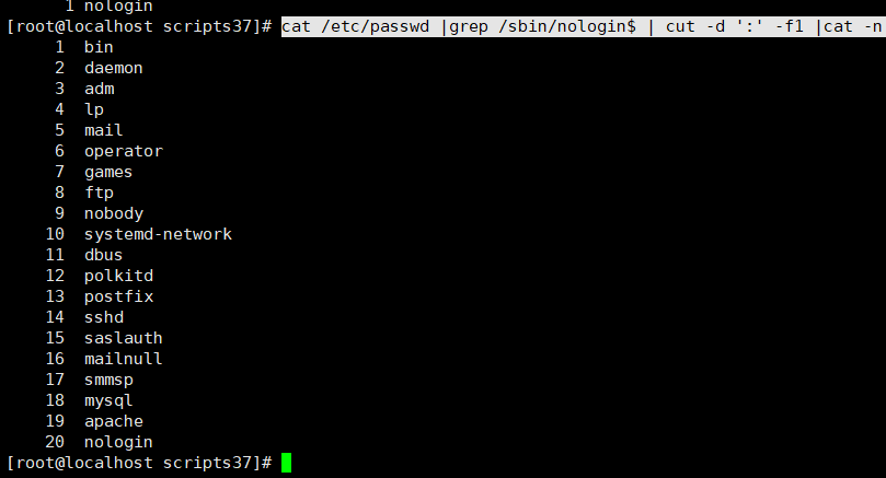 cat /etc/passwd |grep /sbin/nologin$ | cut -d ':' -f1 |cat -n