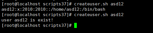 4、编写脚本 createuser.sh,实现如下功能:使用一个用户名做为参数,如果 指定参数的用户存在,就显示其存在,否则添加之;显示添加的用户的id号等 信息