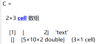 代码运行结果如下。生成了2x3的元胞数组C,其中分别包含了逻辑型、数值型、字符数组、空数组、三维数组、元胞数组。