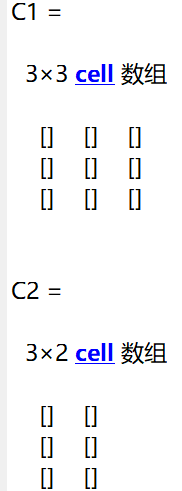 代码运行结果如下。分别生成了3x3的元胞数组和3x2的元胞数组,其中每个元胞存储的内容都是空数组。