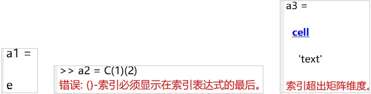 % 定义一个1x1的元胞数组 C = {'text'}; % 做法一,可以取出'text'的第二个字符e a1 = C{1}(2) % 做法二,不能取出'text'的第二个字符e,报错 a2 = C(1)(2) % 做法三,不能取出'text'的第二个字符e,报错 a3 = C(1) a4 = a3(2)