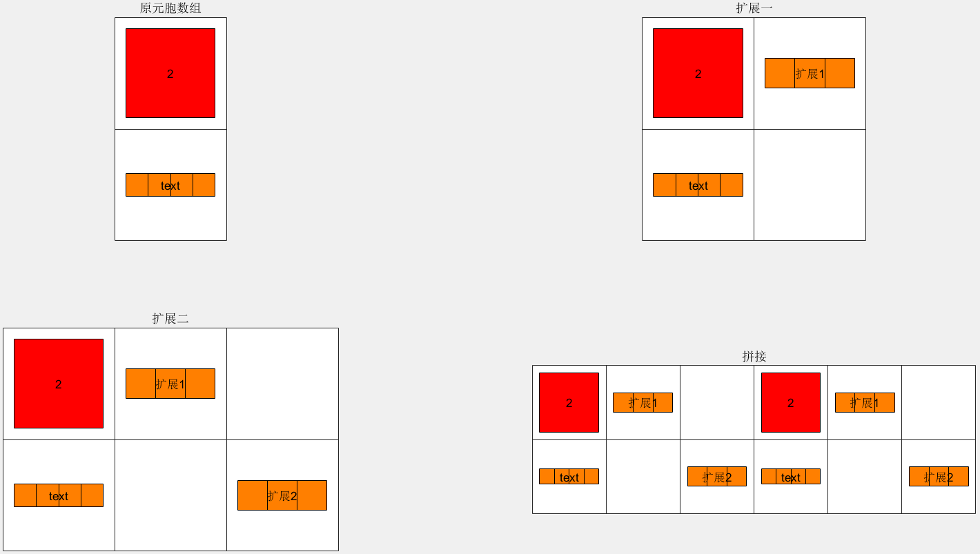 figure % 2x1的元胞数组 C = {2; 'text'}; subplot(2, 2, 1); title('55'); cellplot(C); title('原元胞数组') %做法一: C(1, 2) = {'扩展1'}; subplot(2, 2, 2); cellplot(C); title('扩展一'); %做法二: C(2, 3) = {'扩展2'}; subplot(2, 2, 3); cellplot(C); title('扩展二'); %做法三:水平拼接,待拼接的元胞数组的行数必须相等 C = [C, C]; subplot(2, 2, 4); cellplot(C); title('拼接');