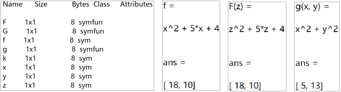 代码运行结果如下。从图中可以看出符号表达式与符号函数之间的区别,它们的类型不同,且计算函数值的方式的也不同。