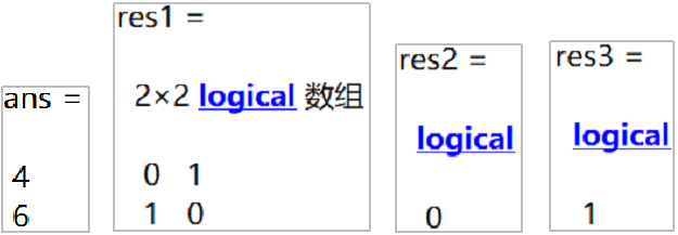 %关系运算 syms x assume(x > 2); %假设x是大于2的 solve((x + 1)*(x - 1)*(x - 2)*(x - 4)*(x - 6) == 0) %在设定的条件下,解方程 %函数isAlways、isequal以及isequaln %--isAlways:判断两个符号式构成的关系比较式的真假 A1 = [x, sym(9); 2*x^2, tan(x)]; B1 = [2*x, sym(6); x^2, sin(x)/cos(x)]; res1 = isAlways(A1 > B1) %对于数组情况,分别比较相应元素,结果为同等大小的logical数组 %--isequal和isequaln:都是判断输入的两个符号式是否相等。但前者将NAN视为不相等,后者将NAN视为相等 A2 = [x+1, nan] B2 = [x+1, nan] res2 = isequal(A2, B2) res3 = isequaln(A2, B2) %对于数组情况,相应元素全部相等,返回1;反之,返回0