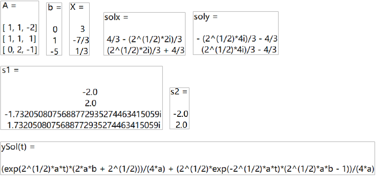 %线性方程:所有未知数都是一次的。可用矩阵形式表示。(用linsolve) syms x y z eqns = [x+y-2*z == 0, x+y+z == 1, 2*y-z == -5]; [A, b] = equationsToMatrix(eqns) %将线性方程转为矩阵形式 X = linsolve(A, b) %linsolve函数的参数是矩阵形式的线性方程 %非线性方程:(用solve函数或vpasolve函数) %--求解析解 syms x y eqns = [2*x^2 + y^2 == 0, 2*x - y == 4]; [solx soly] = solve(eqns, [x y]) %--求数值解 syms x eqn = x^6 - x^2 == 2; s1 = vpasolve(eqn, x) %不指定求解范围 s2 = vpasolve(eqn, x, [-3, 3]) %指定求解范围 %常微分方程:未知函数是一元函数的微分方程称作常微分方程 syms y(t) a b eqn = diff(y, t, 2) == 2 * a^2 * y; %二阶常微分方程 diffY = diff(y, t); cond = [y(0)==b, diffY(0)==1]; %初始条件 ySol(t) = dsolve(eqn, cond)
