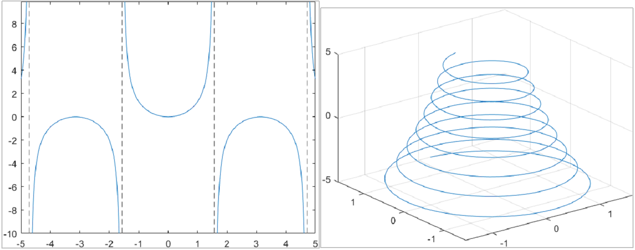 syms x fplot(tan(x) * sin(x)); %2D曲线 syms t xt = exp(-t/10).*sin(5*t); %参数方程 yt = exp(-t/10).*cos(5*t); zt = t; figure fplot3(xt, yt, zt) %3D曲线