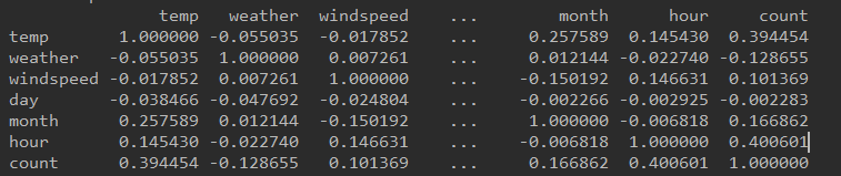 corr = df_train_origin[['temp', 'weather', 'windspeed', 'day', 'month', 'hour', 'count']].corr()