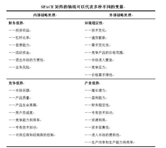 SPACE 矩阵要按照被研究企业的情况而制定,并要依据尽可能多的事实信息。根据企业类型的不同,SPACE 矩阵的轴线可以代表多种不同的变量。如,投资收益、财务杠杆比率、偿债能力、流动现金、流动资金等。