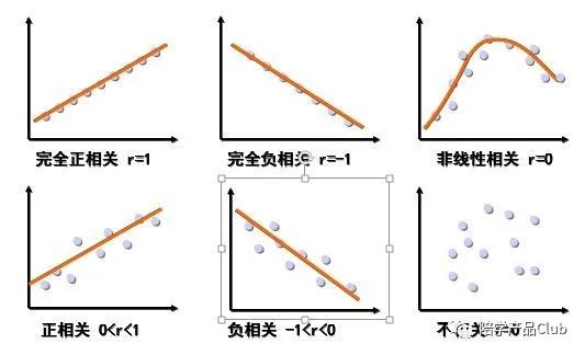 如果变量之间不存在相互关系,那么在散点图上就会表现为随机分布的离散的点,如果存在某种相关性,那么大部分的数据点就会相对密集并以某种趋势呈现。