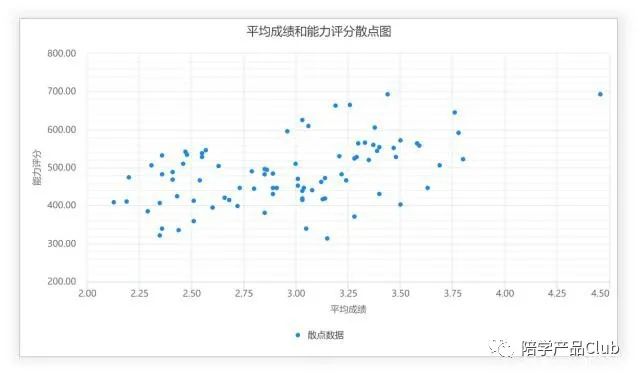 如上图,展现了平时成绩与能力评分之间的关系情况:X增大时,Y会明显的增大,说明X和Y之间有着正向相关关系。