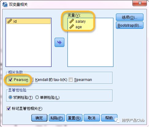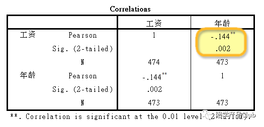 计算结果sig=0.002,即原假设不成立。现实意义为年龄与工资水平有着极显著的相关关系,也就是说随着年龄的增加,工资会逐渐下降。