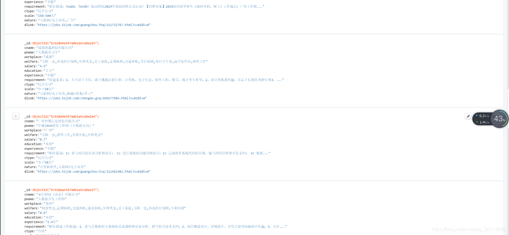 招聘爬虫+数据分析 1.爬虫: 采用Scrapy 分布式爬虫技术,使用mongodb作为数据存储,爬取的网站Demo为51job,数据我目前爬了有几千条