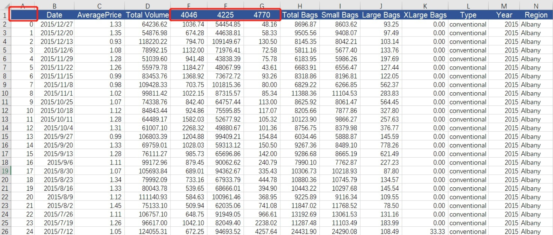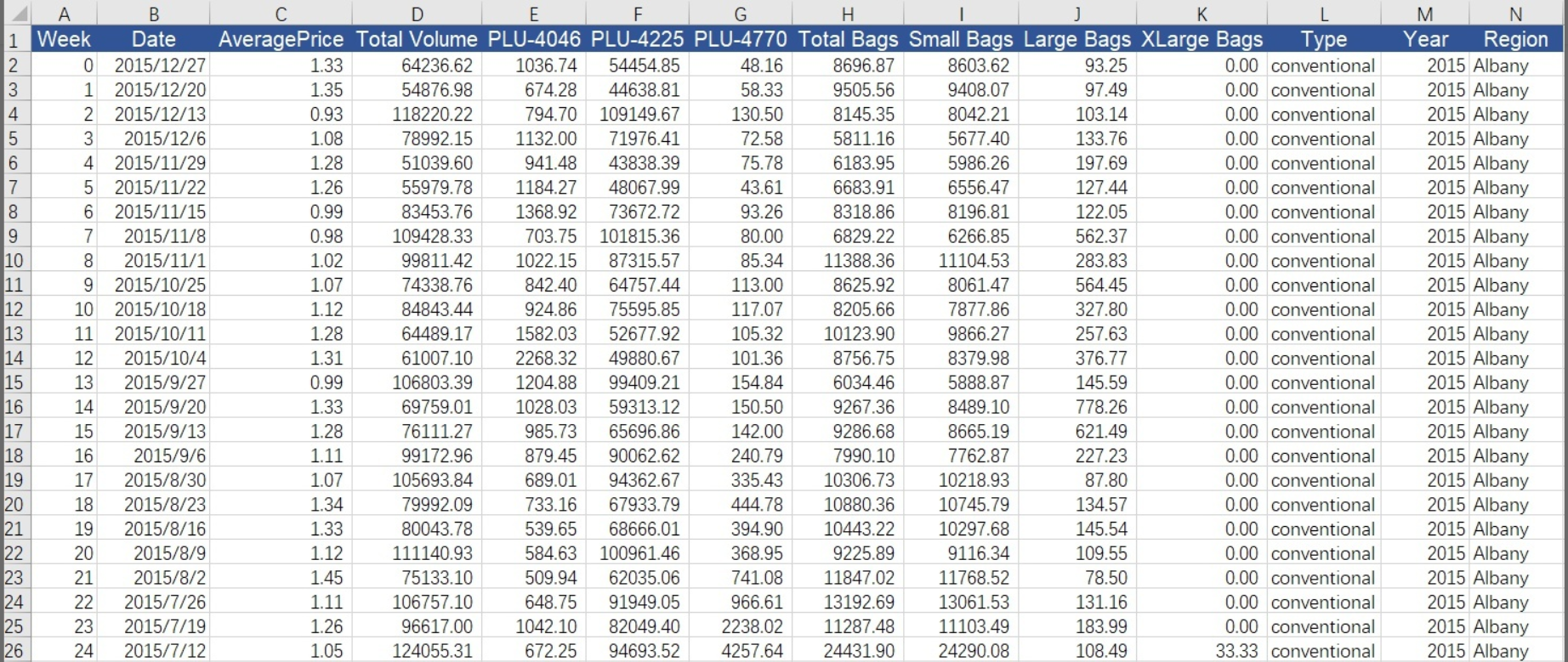 新表包含14列,分别为第几周,日期,单个牛油果的平均价格,牛油果销售总量,PLU-4046的销售个数,PLU-4225的销售个数,PLU-4770的销售个数,袋装牛油果的销售总量,小袋牛油果销售个数,大袋牛油果销售个数,超大袋牛油果销售个数,牛油果类型,年份,地区。