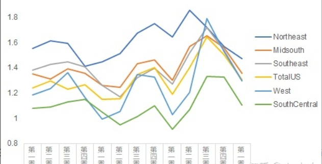 其中Midsouth地区销量一直低于其他区,之前我们看到Midsouth的牛油果价格也偏高,也许是因为这个地区本身牛油果产量少,需要从周边地区引进,导致价格较高,销量较小;