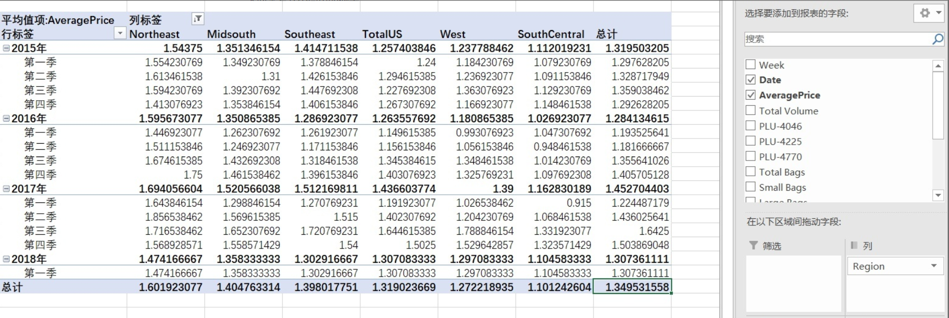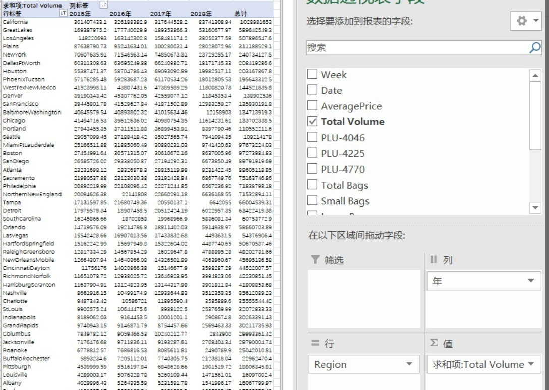 地区Region表示美国不同地区的牛油果销售量,包含部分城市、西部、东北部等地区和全美总体数据。