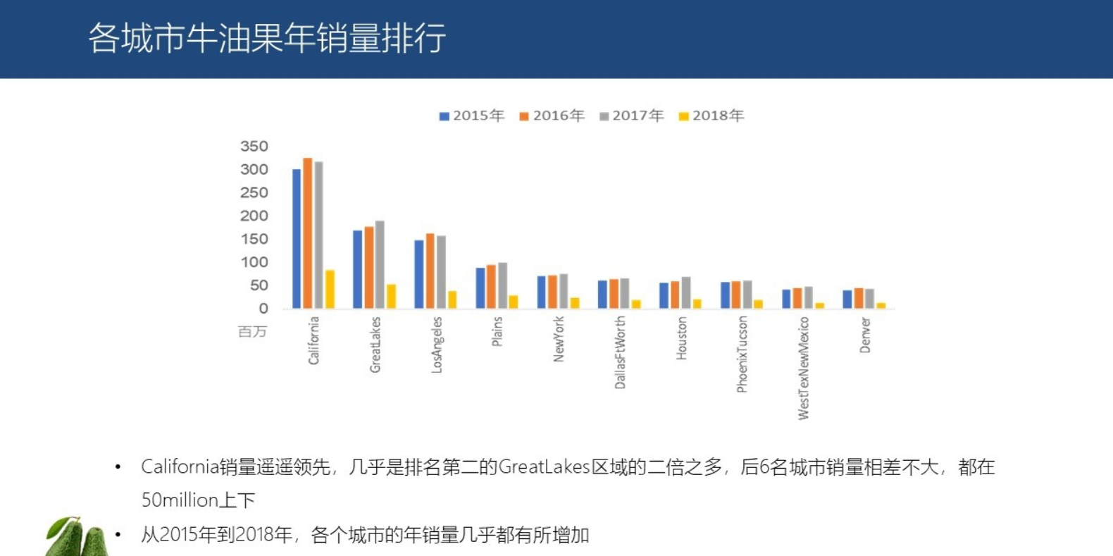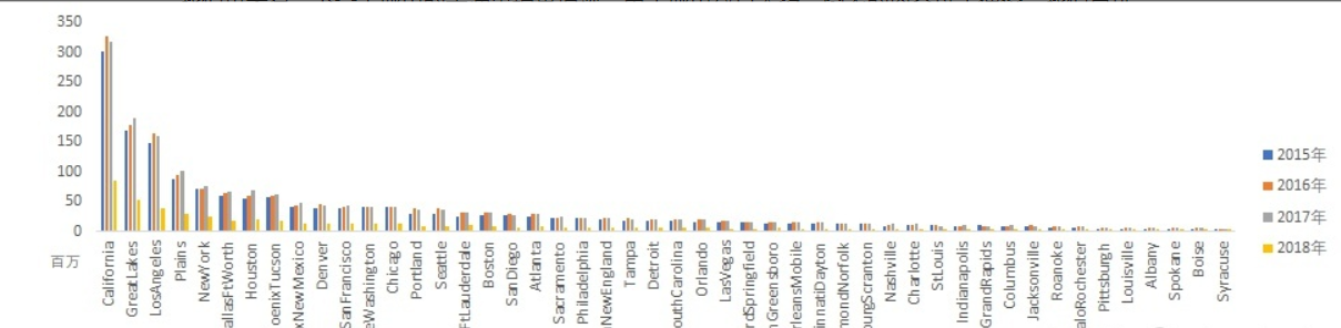 从2015年到2018年,各个城市的年销量几乎都有所增加。如果再结合人口数据,我们可以进一步判断销量的增加,更多受居民的人数增加影响还是受居民的购买力增强影响;我们还可以计算人均牛油果消费量来观察各地区居民对牛油果的喜好程度等。但这个表内并没有包含城市的人口数量,所以我们无法获得更多信息。
