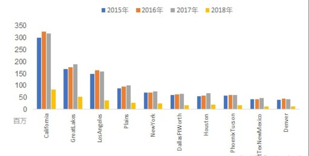 California销量遥遥领先,几乎是排名第二的GreatLakes区域的二倍之多,第五名开始的6个城市销量相差不大,都在50million上下。