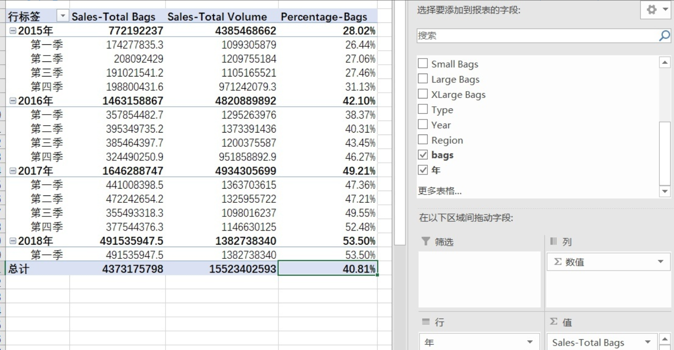 为了观察袋装牛油果的销售情况,我新增了一列来表示以袋出售的牛油果销量占总销量的百分比,记为Percentage-Bags。