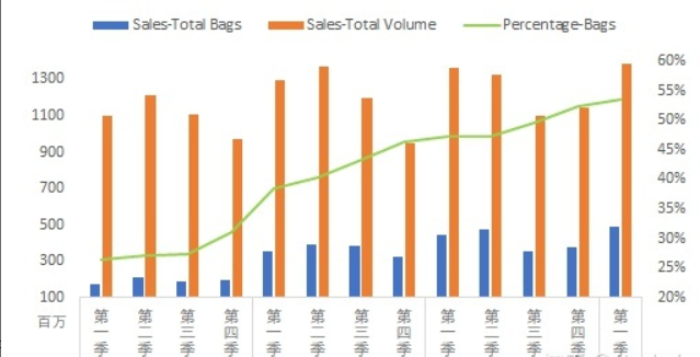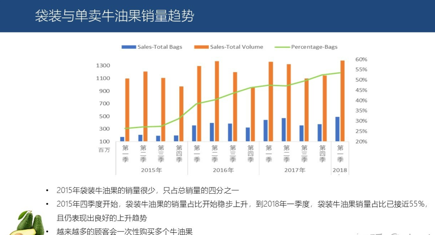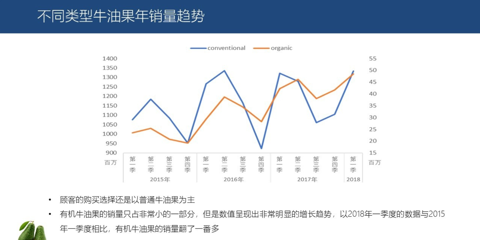 有机牛油果的销量只占非常小的一部分,但是数值呈现出非常明显的增长趋势,以2018年一季度的数据与2015年一季度相比,有机牛油果的销量翻了一番还多。