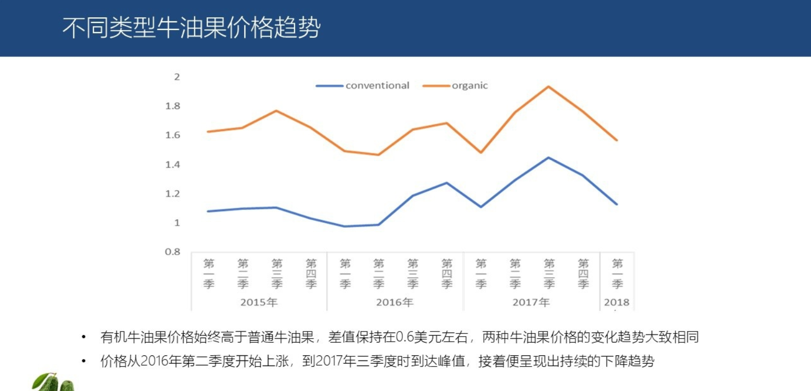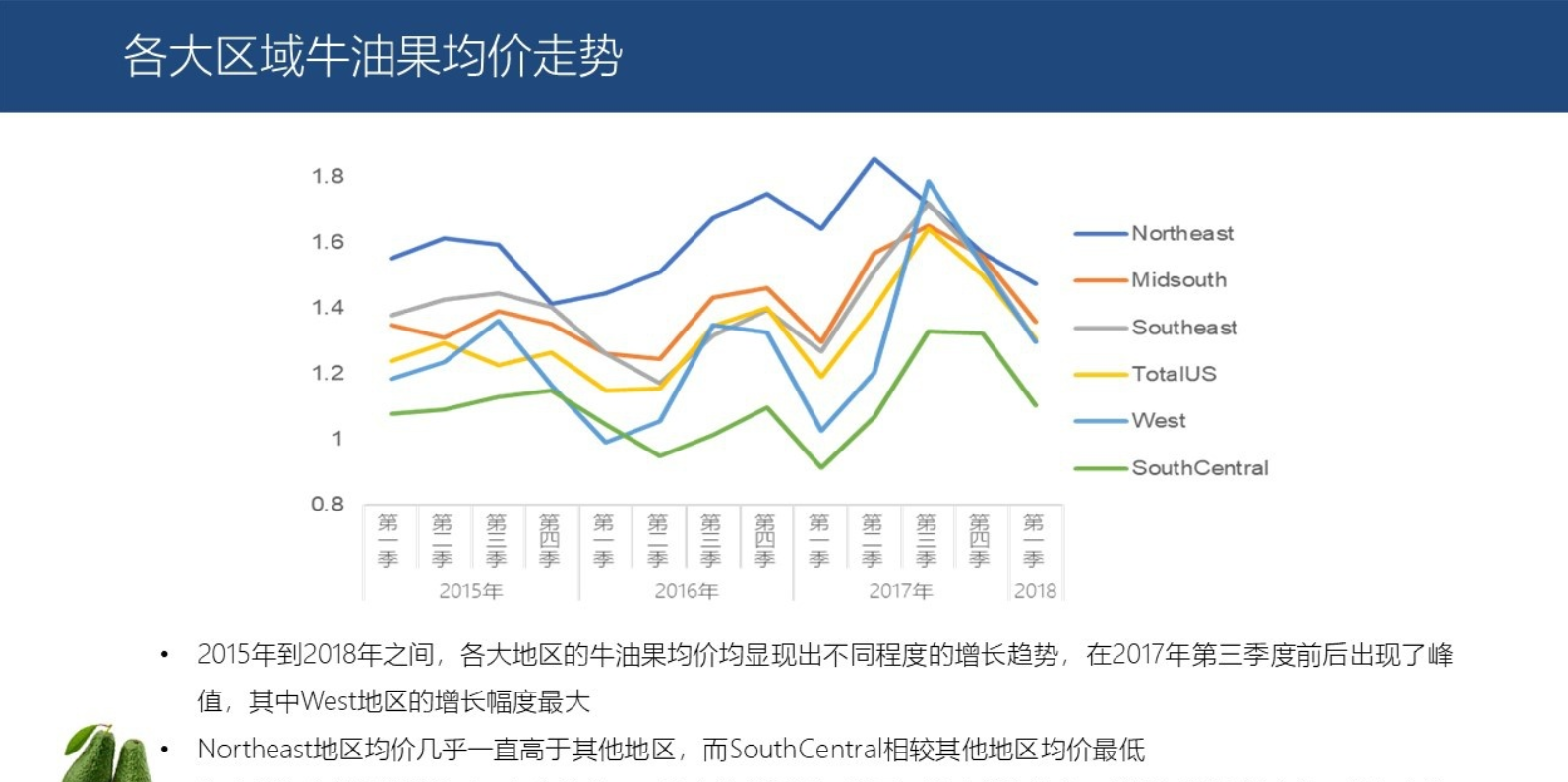 从2016年第二季度,牛油果价格开始上涨,到2017年三季度时到达峰值,接着便呈现出持续的下降趋势。