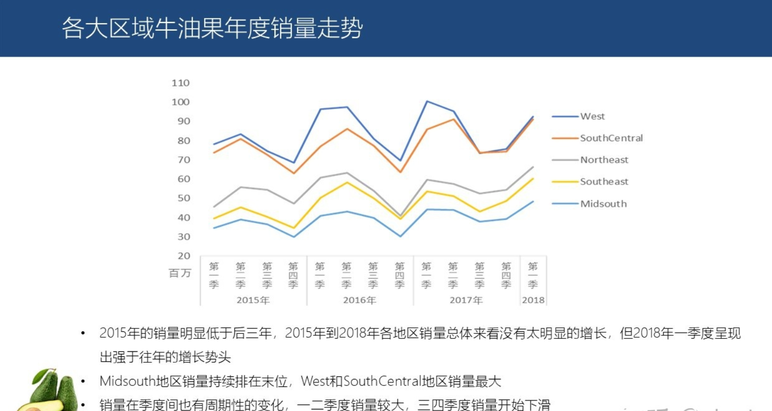牛油果在2015年的销量明显低于后三年,从2015年到2018年各地区销量有轻微上升趋势,总体来看没有太明显的增长,但2018年一季度似乎呈现出强于往年的增长势头。
