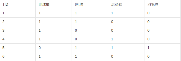 tid是交易单号,后面每一纵列中1代表购买,0代表没买。
