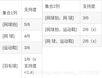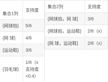 个成员,我们可以看到羽毛球小于支持度0.4,所以跟他有关的我们的直接舍去