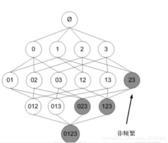 在图中,已知阴影项集{2,3}是非频繁的。利用这个知识,我们就知道项集{0,2,3},{1,2,3}以及{0,1,2,3}也是非频繁的。也就是说,一旦计算出了{2,3}的支持度,知道它是非频繁的后,就可以紧接着排除{0,2,3}、{1,2,3}和{0,1,2,3}。