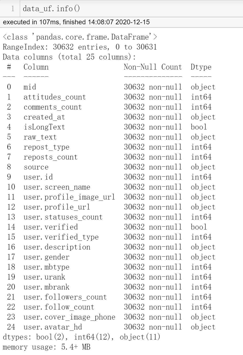 关于每个字段的含义,这里不详述(以后本人再写一篇关于微博字段的文章说明吧)