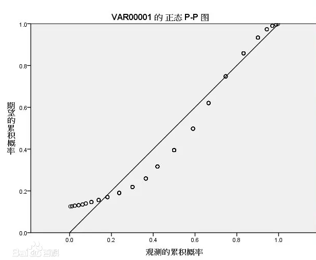 P-P图是根据变量的累积概率对应于所指定的理论分布累积概率绘制的散点图,用于直观地检测样本数据是否符合某一概率分布。如果被检验的数据符合所指定的分布,则代表样本数据的点应当基本在代表理论分布的对角线上。