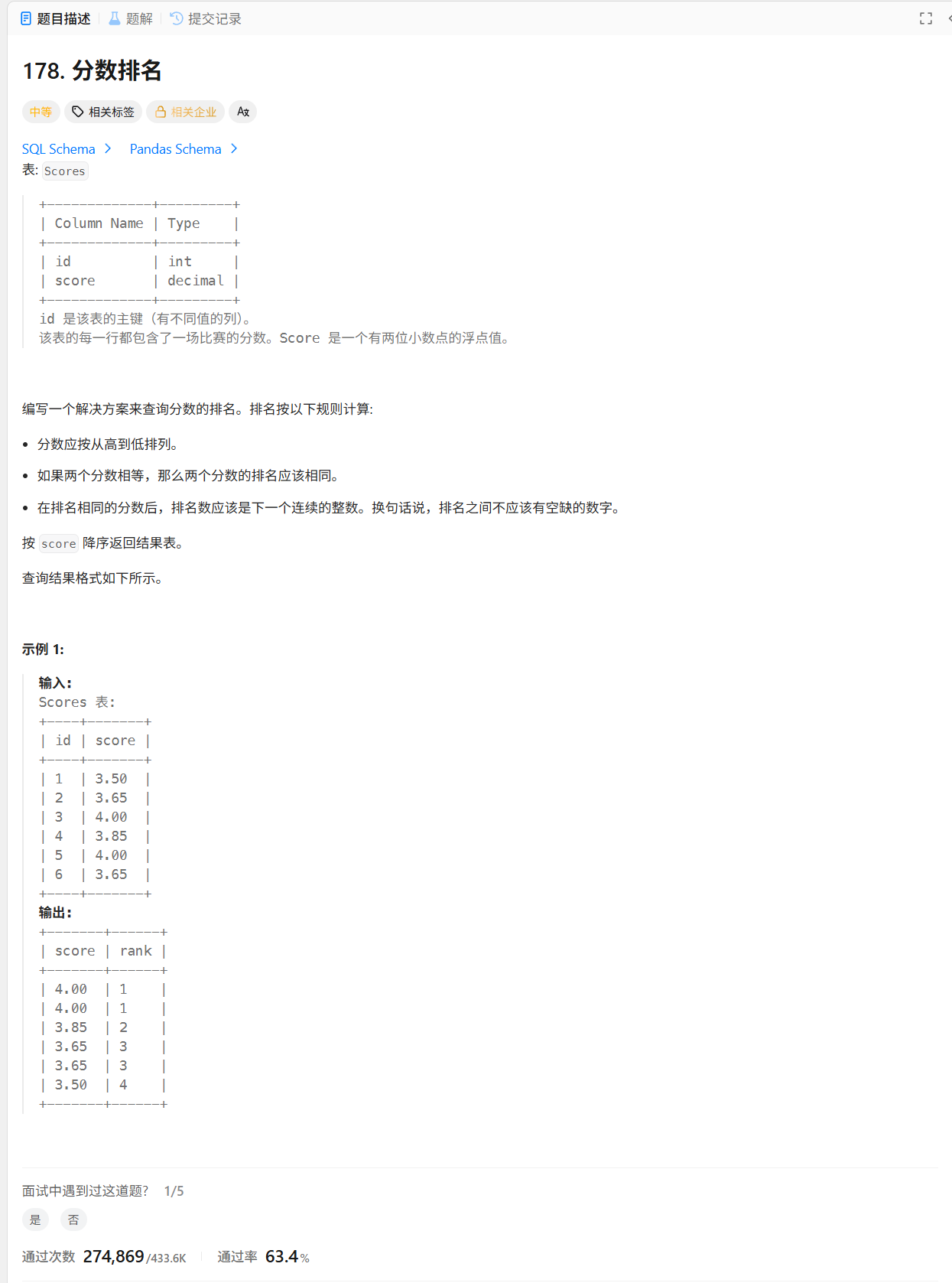 - 同分同级(Ties):如果两个分数相等,它们的排名必须相同。