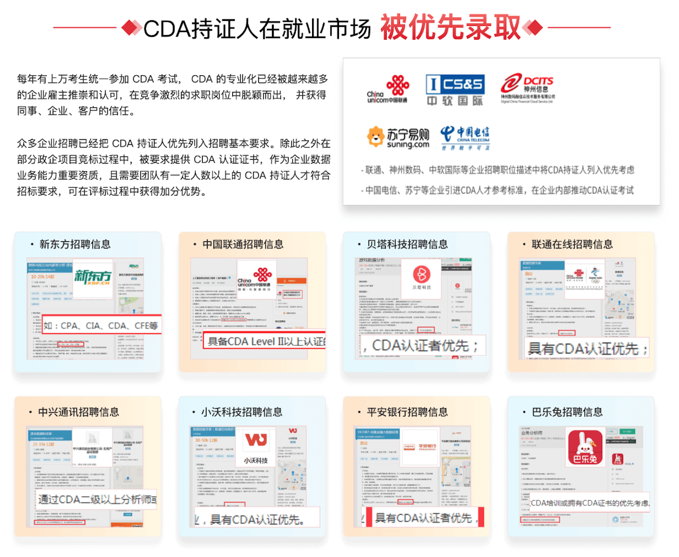 CDA企业认可度非常高,很多企业招聘时注明CDA信息分析师优先,对找工作非常有帮助。很多银行、金融机构的技术岗会要求必须是CDA数据分析师二级以上的持证人。中国联通、央视广信、德勤、苏宁等企业,把CDA持证人列入优先考虑或者对员工的CDA考试给补贴。