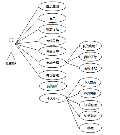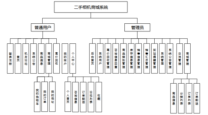 按照基于Spring Boot技术的二手相机商城环境的角色,划分为了普通用户模块和管理员模块这两大部分。