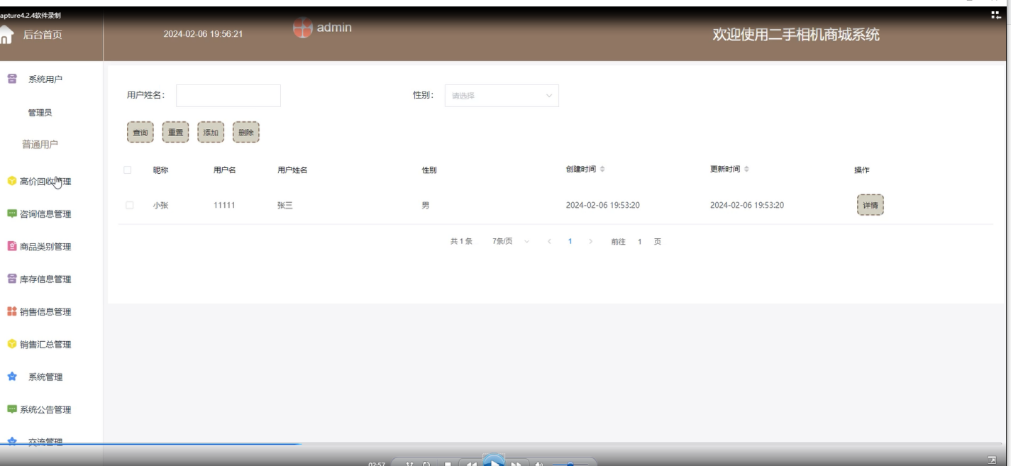 可以对注册的用户进行管理的,也可以对管理员进行管控。界面如下图所示。就是基于Spring Boot技术的二手相机商城系统中的管理人员