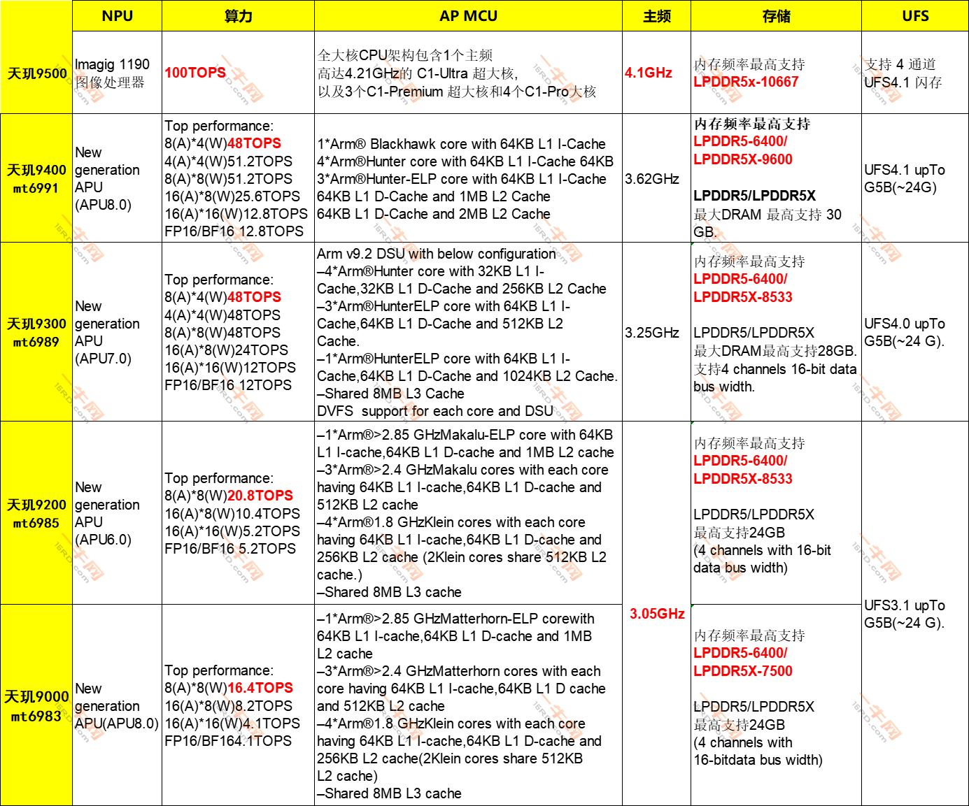 深入解析:MTK5G旗舰系列——天玑9500/9400/9300/9200/9000在AI和处理器性能、DDR频率及UFS的深度对比分析