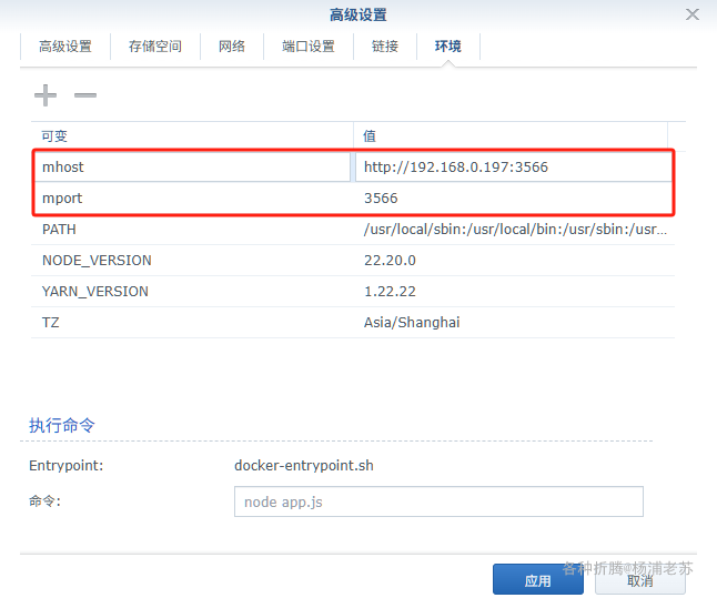mport:本地端口不冲突就行,不确定的话可以用命令netstat -tunlp | grep 端口号查一下mhost:访问地址(用你的设备IP和端口),其中192.168.0.197为老苏群晖主机的IP