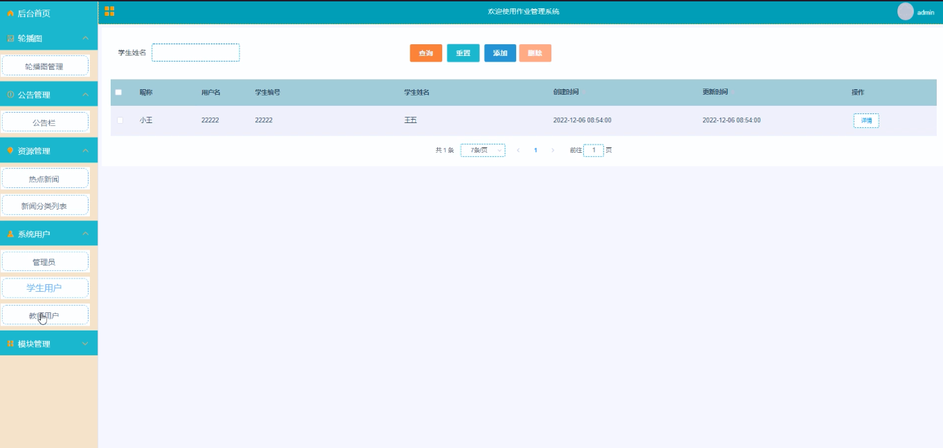 (2)系统用户:管理员点击“系统用户”这一菜单会显示管理员、教师用户和学生用户这三个子菜单,管理员能够对这三个角色的信息进行增删改查管理;