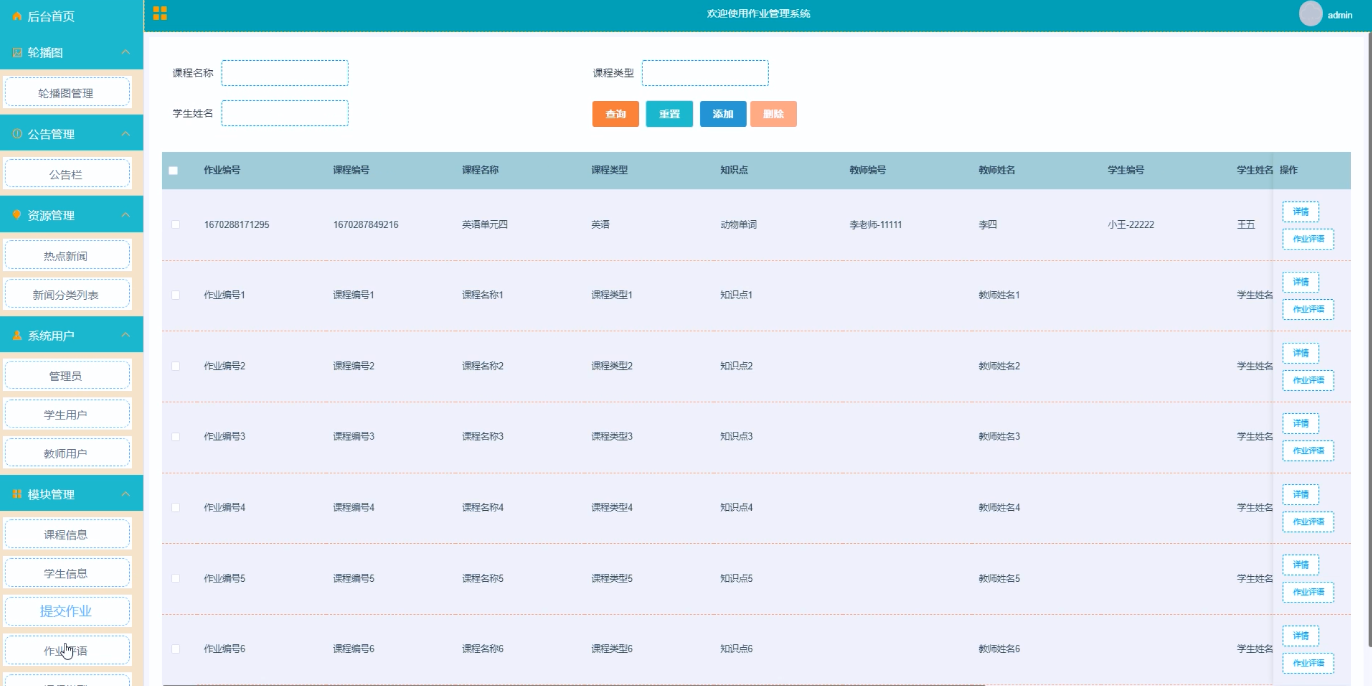 (4)模块管理:在“模块管理”这一菜单下可以对系统当中的学生用户以及教师用户处理的所有信息进行管理,包含了课程信息、学生信息、提交作业、作业评语、课程类型。