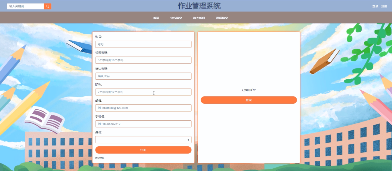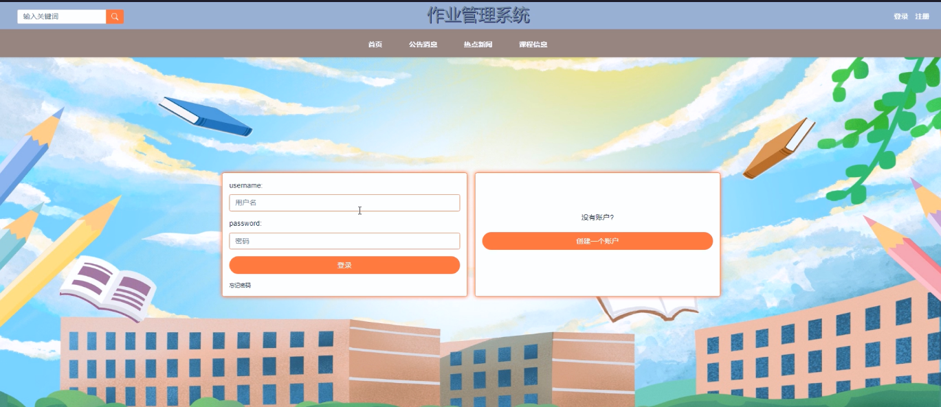 (2)查看作业管理系统的首页信息:作业管理系统的首页信息含有了公告消息、热点新闻、在线交流、课程信息、投诉中心、我的(我的账户、我的收藏、个人中心)。