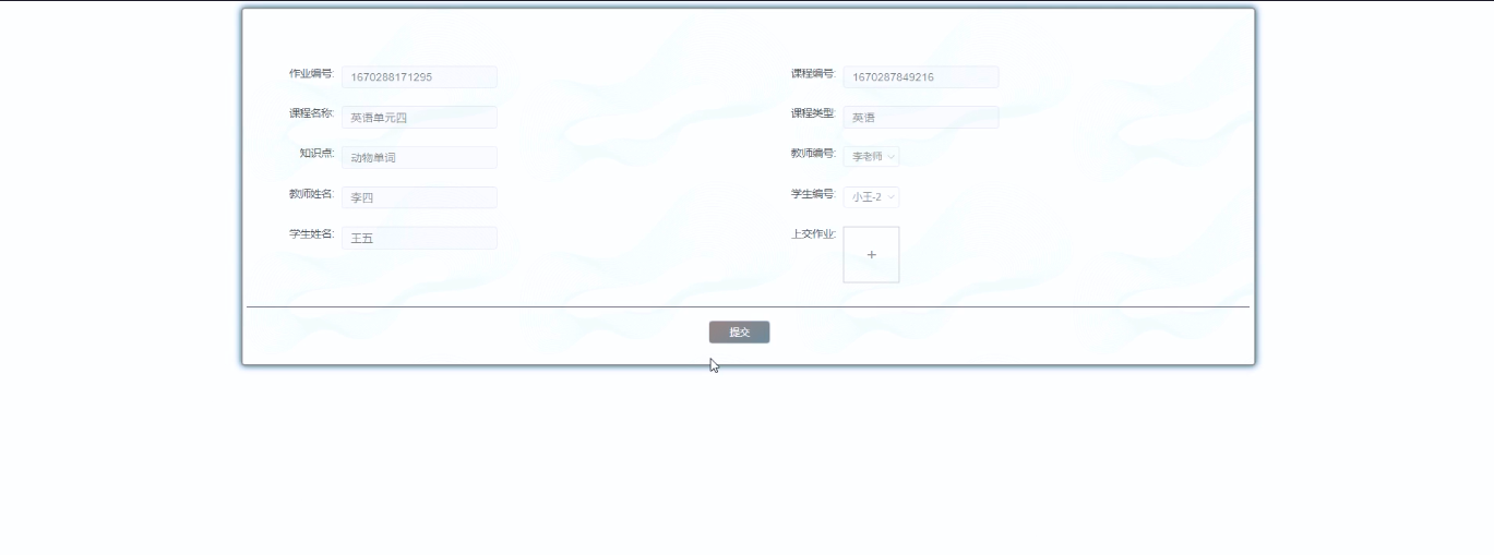 (6)提交作业:当用户在课程信息详情界面想要进行提交作业,点击下方的“提交作业”按钮,就会跳转到提交作业信息填写界面,根据界面提示输入提交作业信息,点击“提交”按钮,提交作业就完成了;