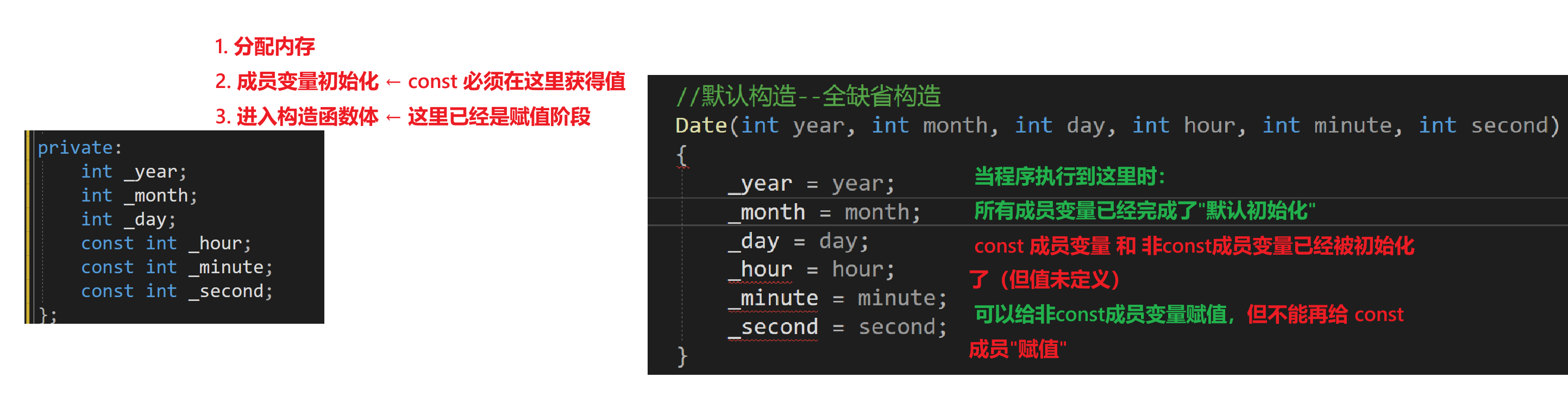 const成员变量必须在构造函数的初始化列表中进行初始化,因为一旦初始化后,其值就不能再改变。