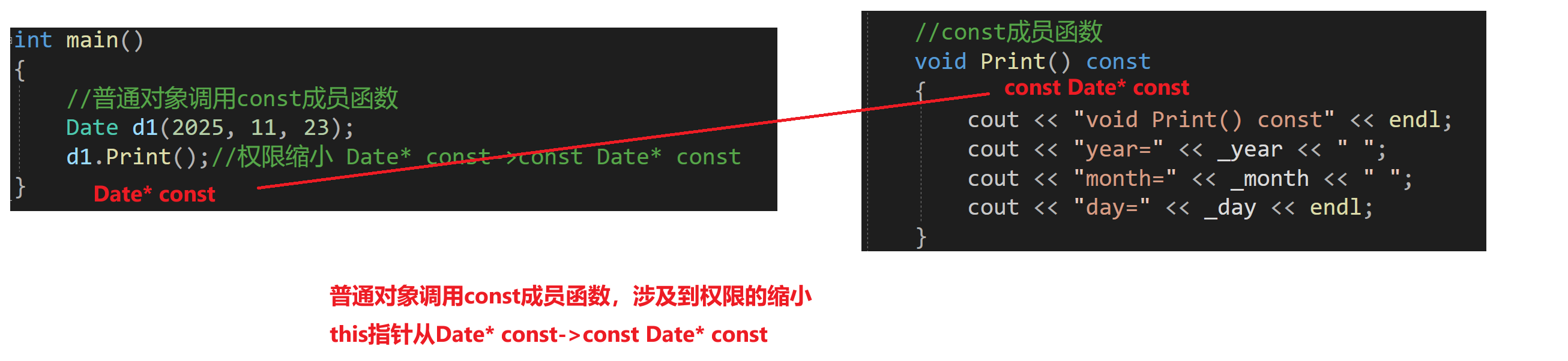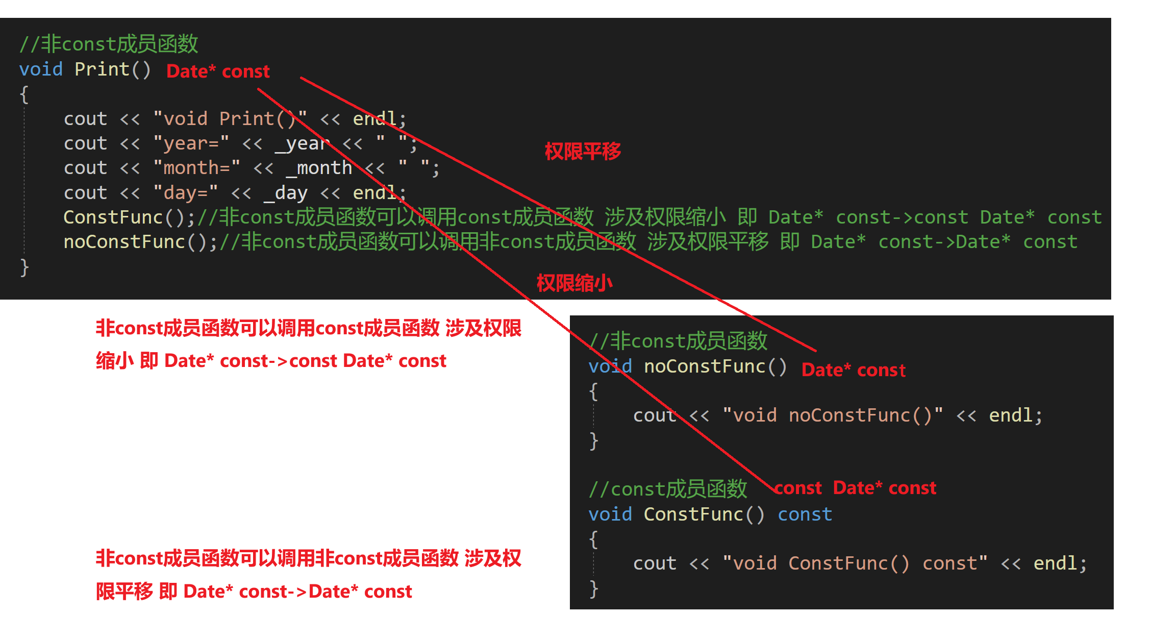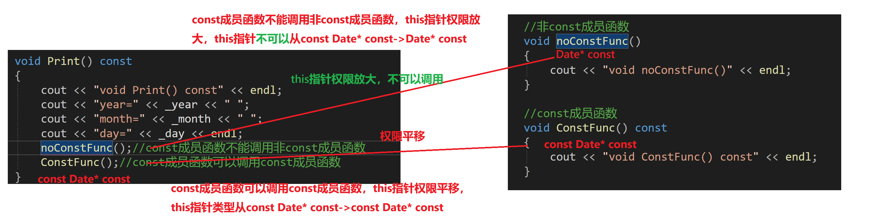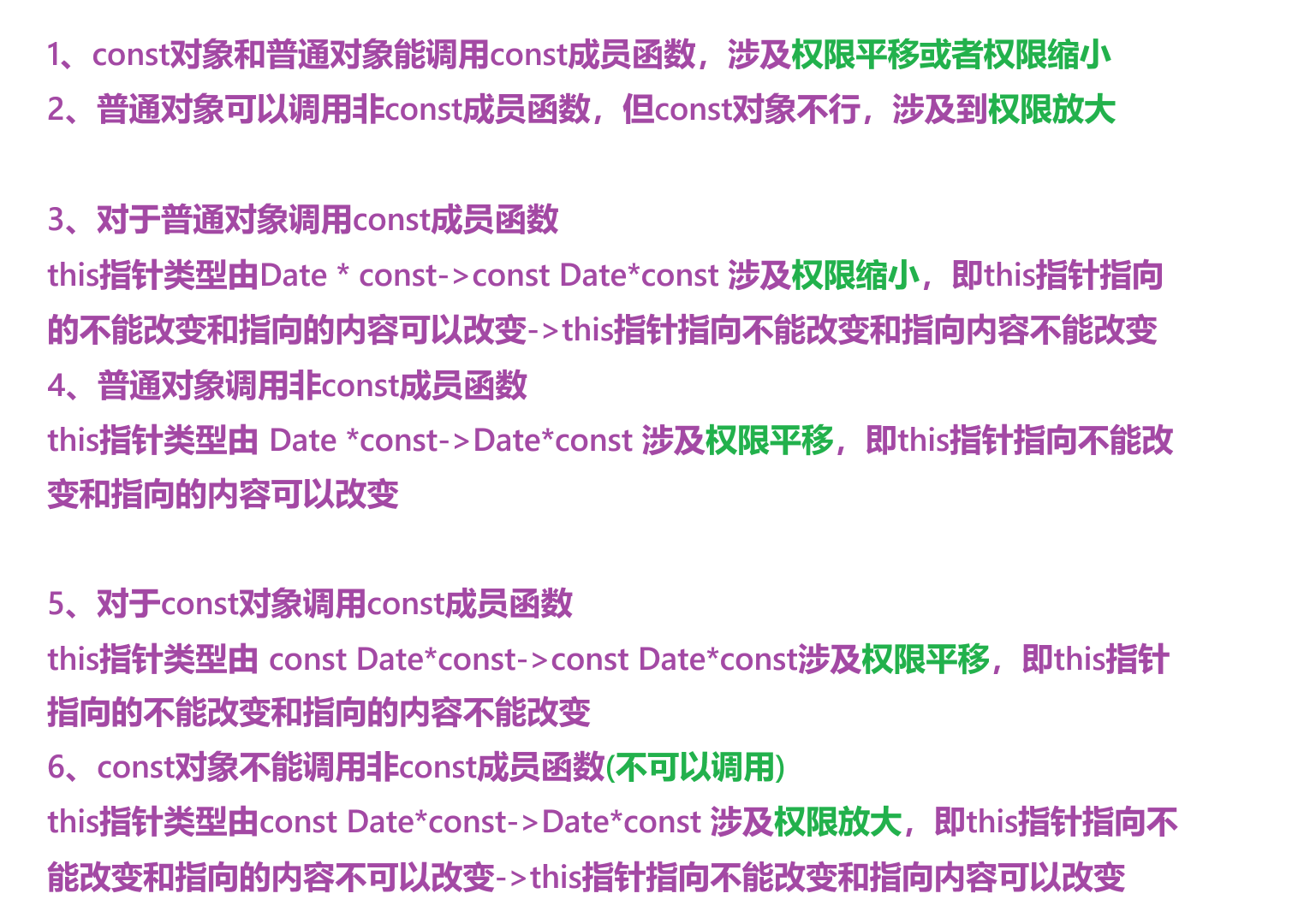 对于const成员函数,对于是否可以调用只需要观察this指针权限的情况,权限平移和权限缩小都可以,但是权限放大不行。