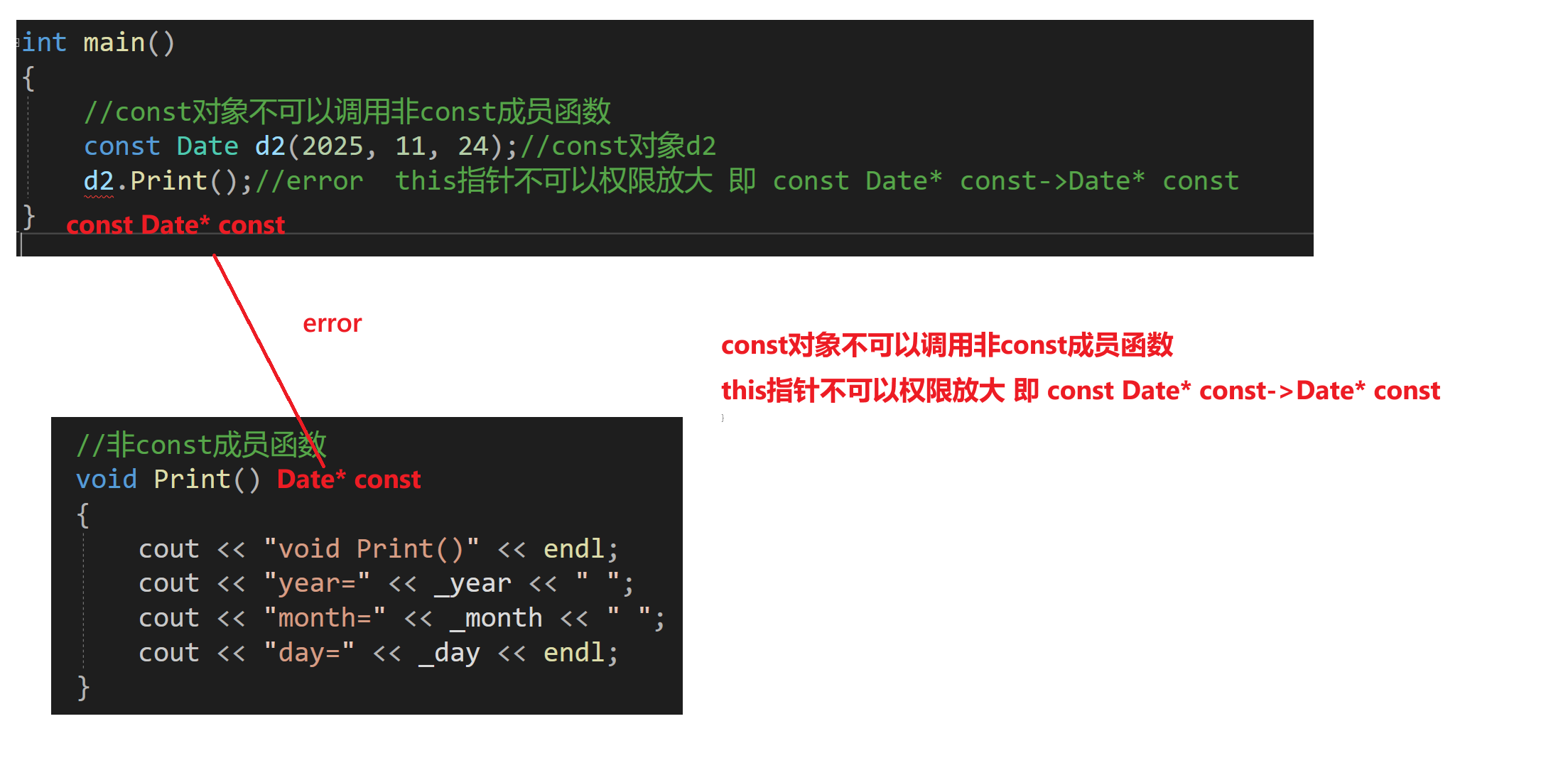 d2.Print();//error this指针不可以权限放大 即 const Date* const->Date* const