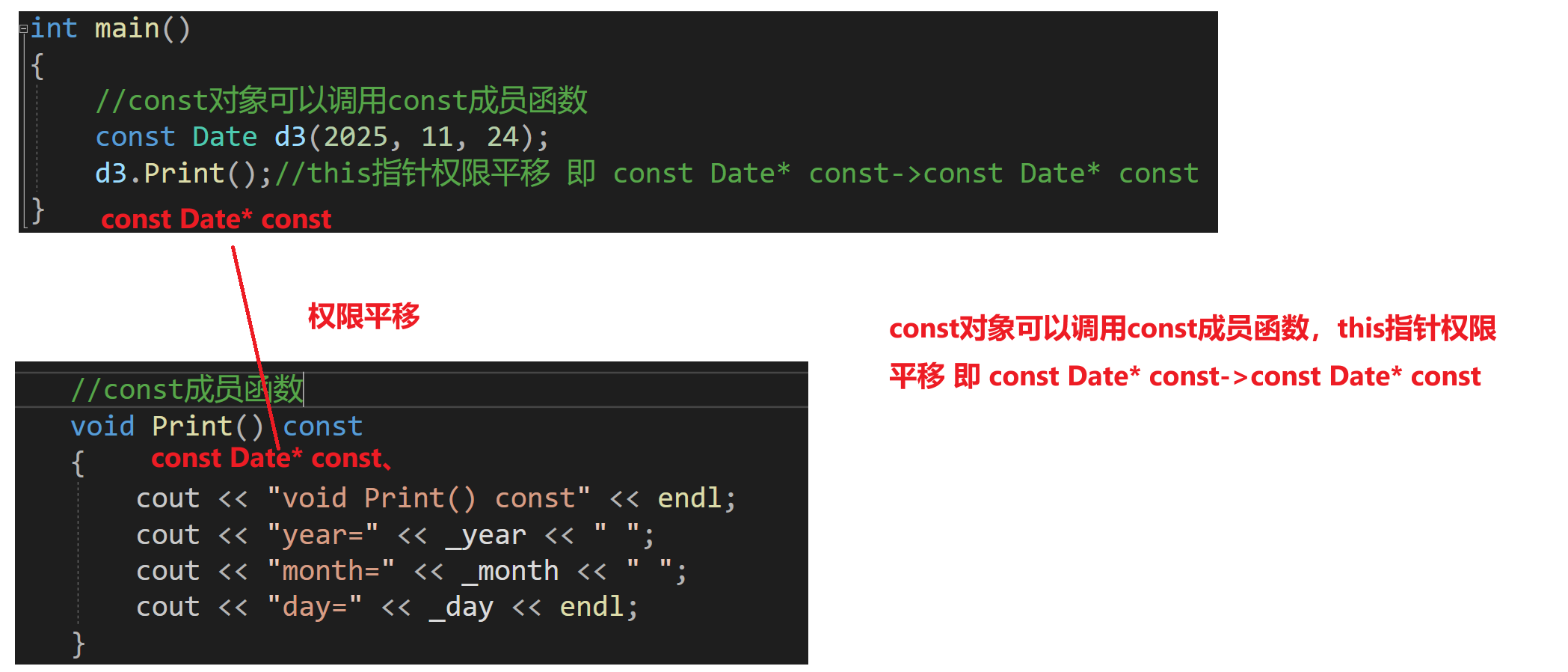 d3.Print();//this指针权限平移 即 const Date* const->const Date* const