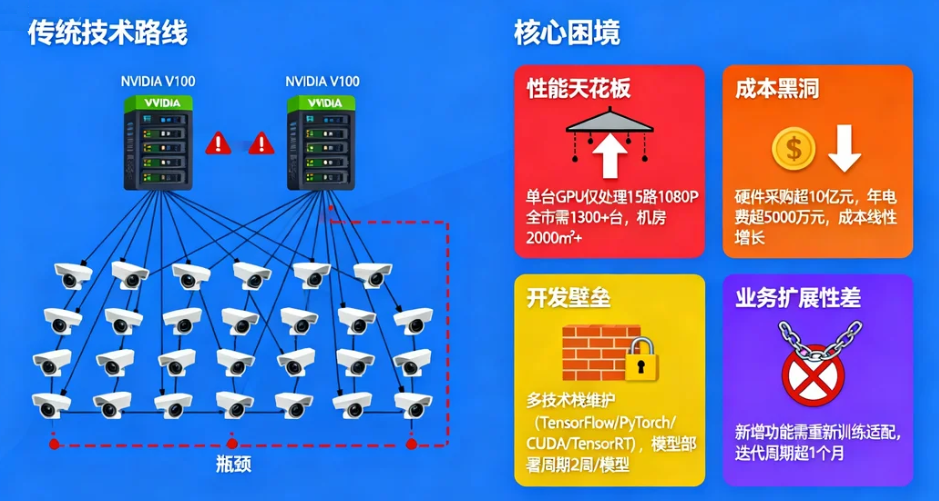 - 性能天花板:单台GPU服务器(NVIDIA V100)仅能处理15路1080P视频的实时分析,全市部署需1300+台服务器,机房面积超2000㎡;