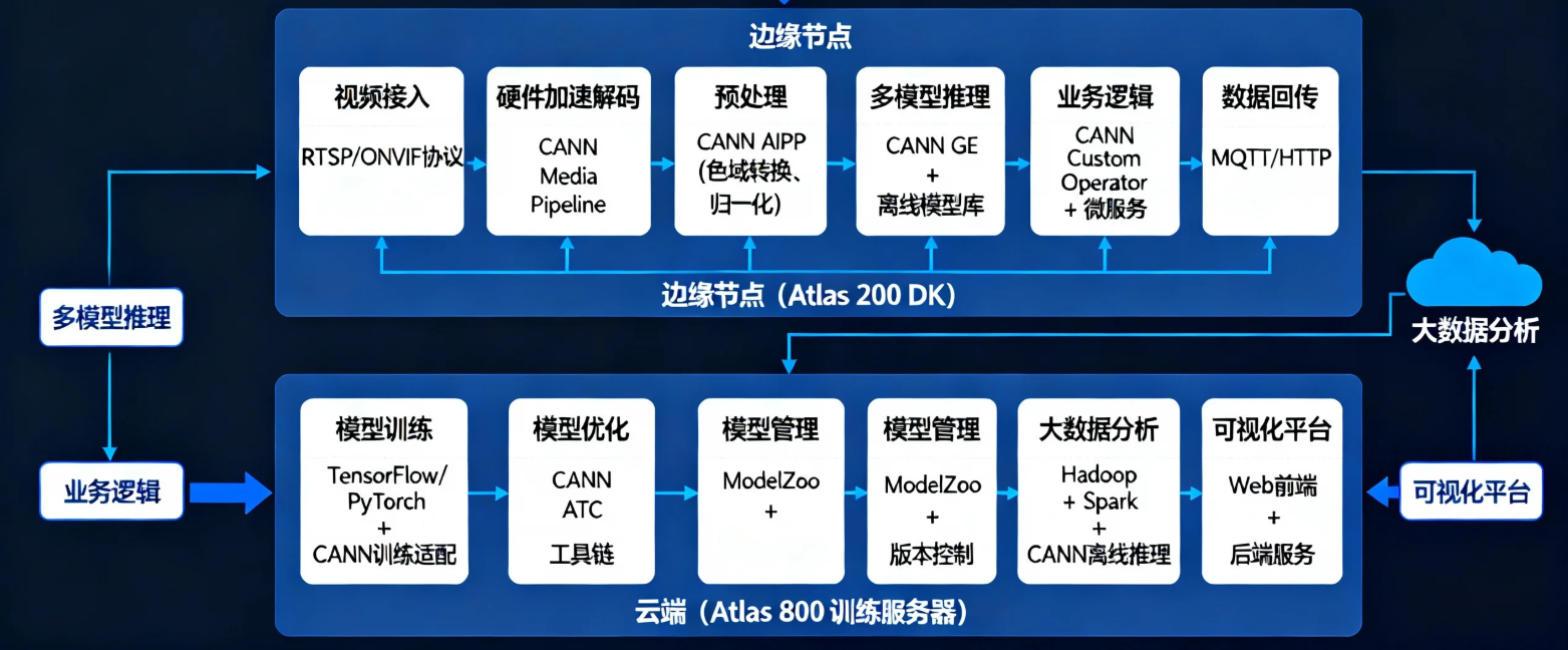 - 边缘侧(Atlas 200 DK)承担实时视频分析任务,利用CANN的硬件加速能力实现低延迟推理;