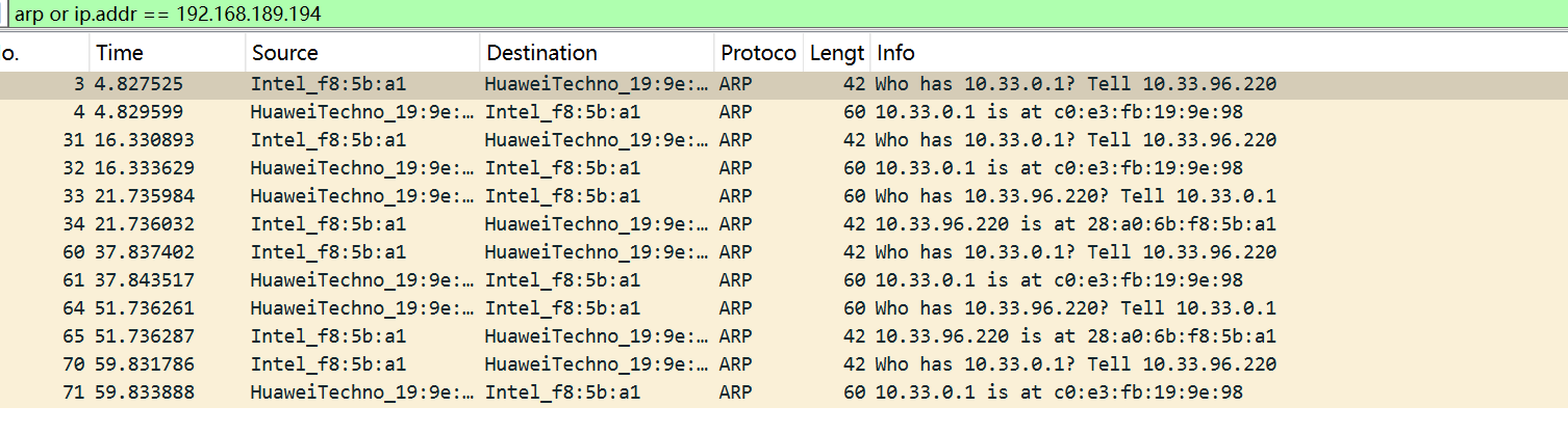 # 过滤器查看ARP欺骗包 输入过滤规则arp(这里我多写了ip.addr==,不影响,只截取了arp部分)