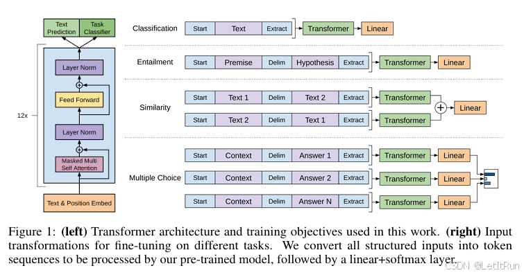 目的是要把NLP中一些很不同的子任务表示成1.2.2.微调中所需的形式,即一系列token序列和该序列所对应的label。图1中左边是预训练模块和需要微调的部分,并在右边给了NLP四大最常见的应用(在所有任务中,label都是以正常的token形式输入的):